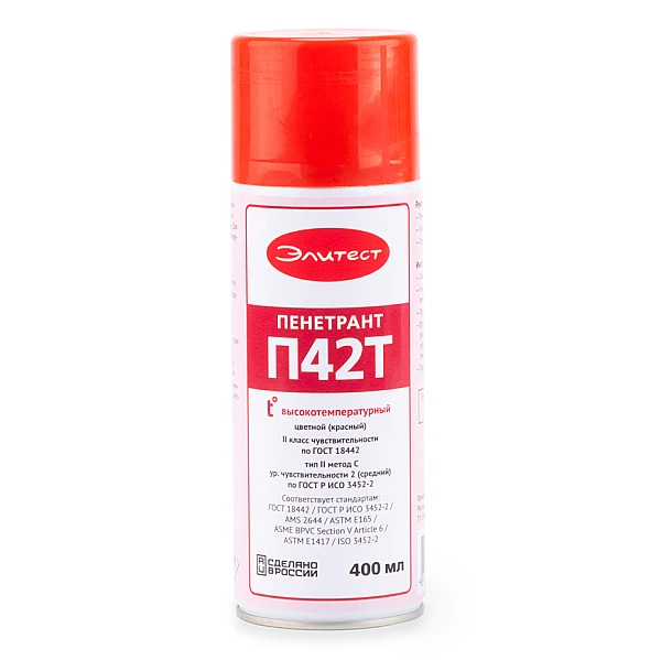 Красный пенетрант П42Т используется для выявления поверхностных дефектов при капиллярном контроле объектов, температура которых достигает +200 °С. Это дает преимущество при проведении контроля изделий на тех стадиях производственного цикла, где присутствуют высокие температуры: например, можно контролировать сварные швы, не дожидаясь их полного остывания.