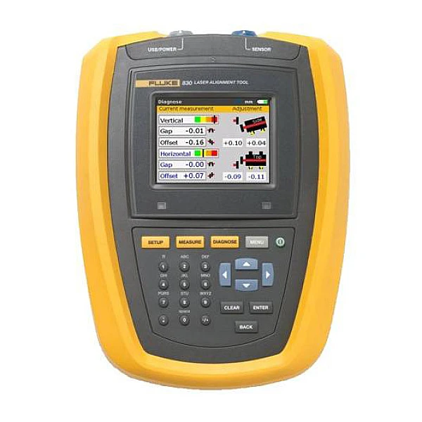 Основное преимущество инструмента центрирования Fluke 830 перед циферблатными индикаторами — выполнение сложных расчётов центрирования, позволяющих ускорить процесс центрирования. При этом графический интерфейс не уступает по наглядности обычной линейке, благодаря чему для использования прибора не требуется специальных знаний.