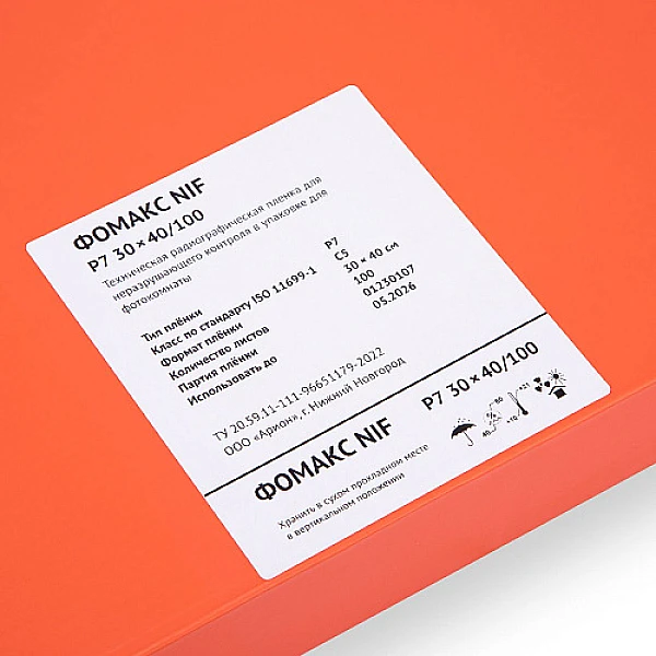 Пленка ФОМАКС Р7 производится в формате листовой радиографической пленки. Пленка листового формата упаковывается по 100 листов в светонепроницаемый конверт.