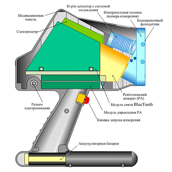 Расчет массовой доли анализируемых элементов основан на зависимости интенсивности излучения от его массовой доли в пробе. При расчете используется безэталонный вариант метода фундаментальных параметров. Анализатор выполнен в виде моноблока и предназначен для работы в полевых и цеховых условиях, а также стационарно в лаборатории.